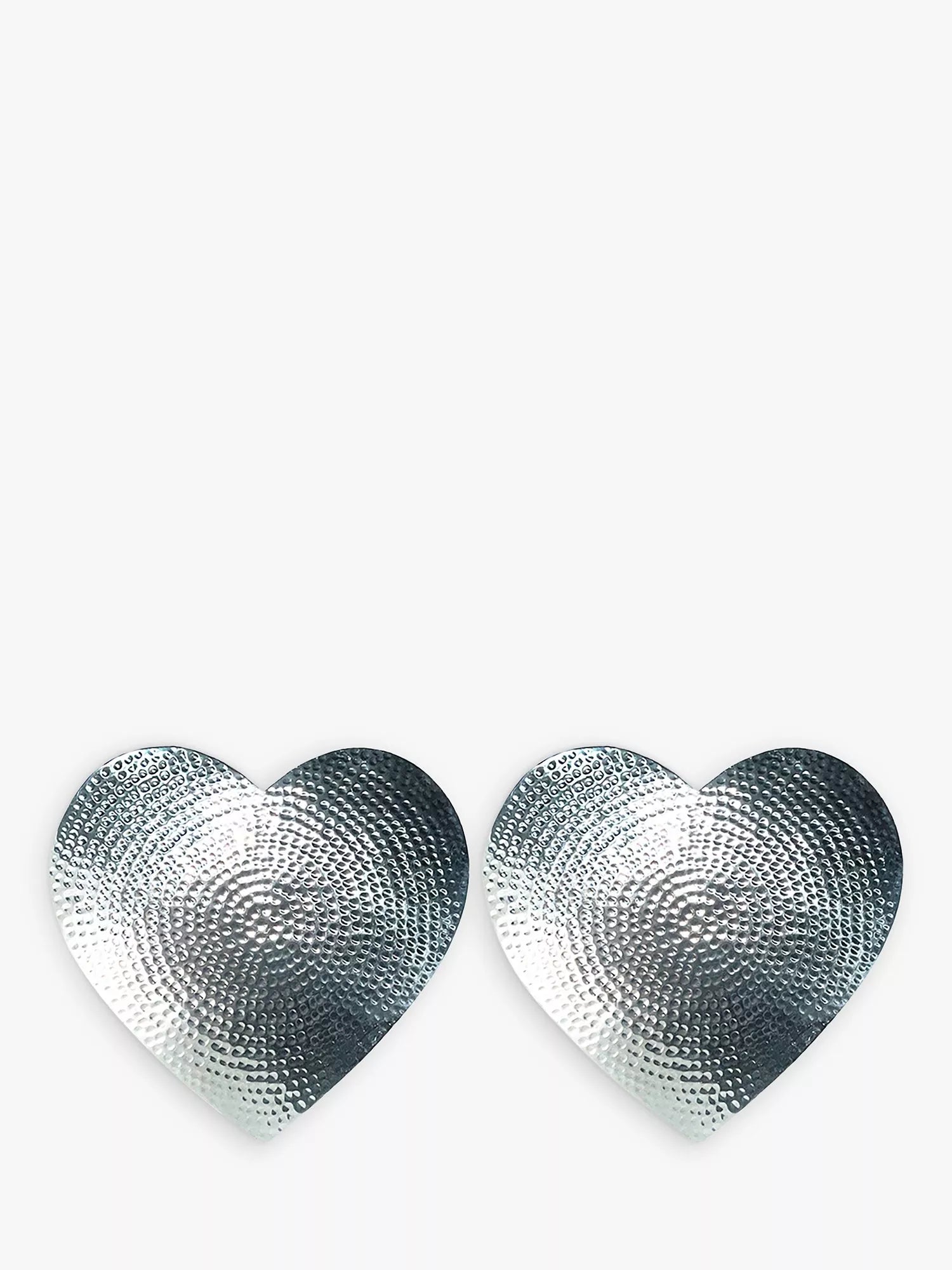 Beautiful, hand-beaten pair of stainless steel heart-shaped placemats, a contemporary and elegant look for any table and any occasion.