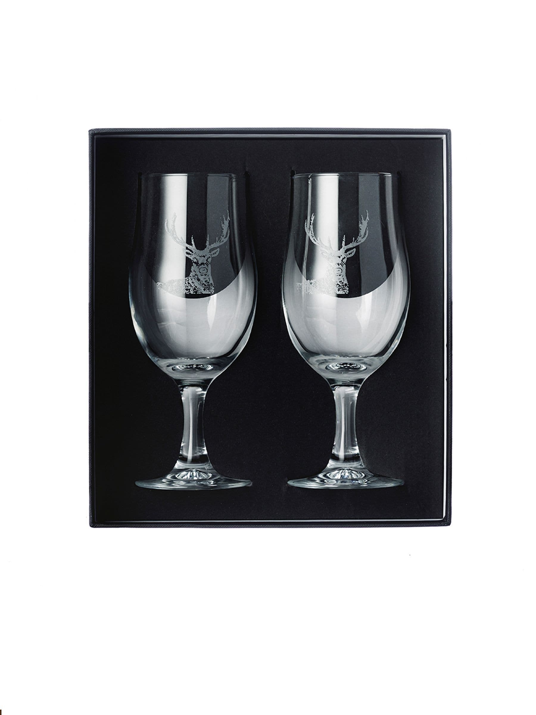 A set of 2 contemporary craft beer glasses each featuring a striking print of a stag.