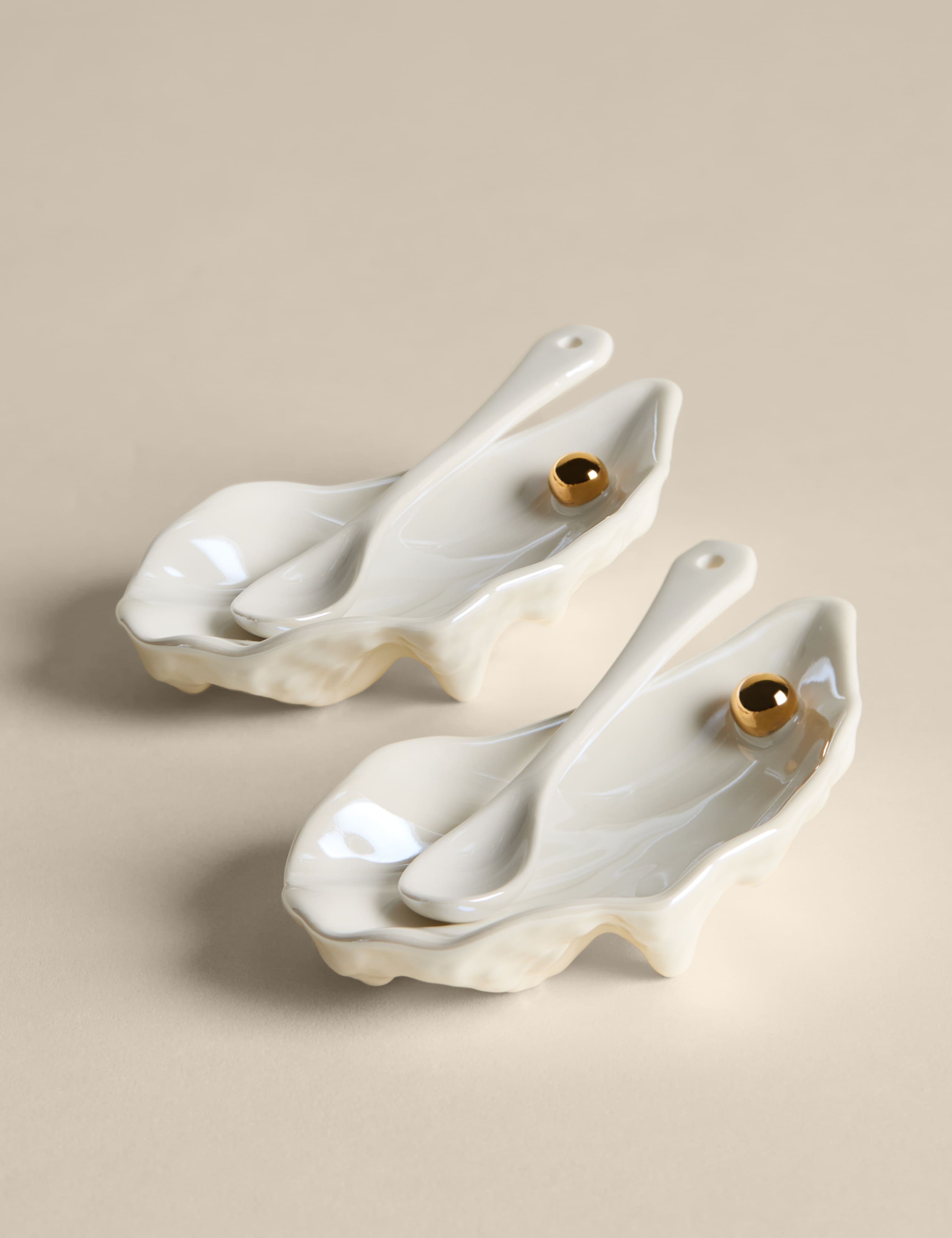 Read MoreDesigned to hold fresh oysters or your favourite seasonings, these pinch pots are crafted from fine china for a beautifully intricate finish. They come as a matching set of two, each with an oyster-shell silhouette and embellished with gold-tone detailing. Two miniature serving spoons complete the delicate look.