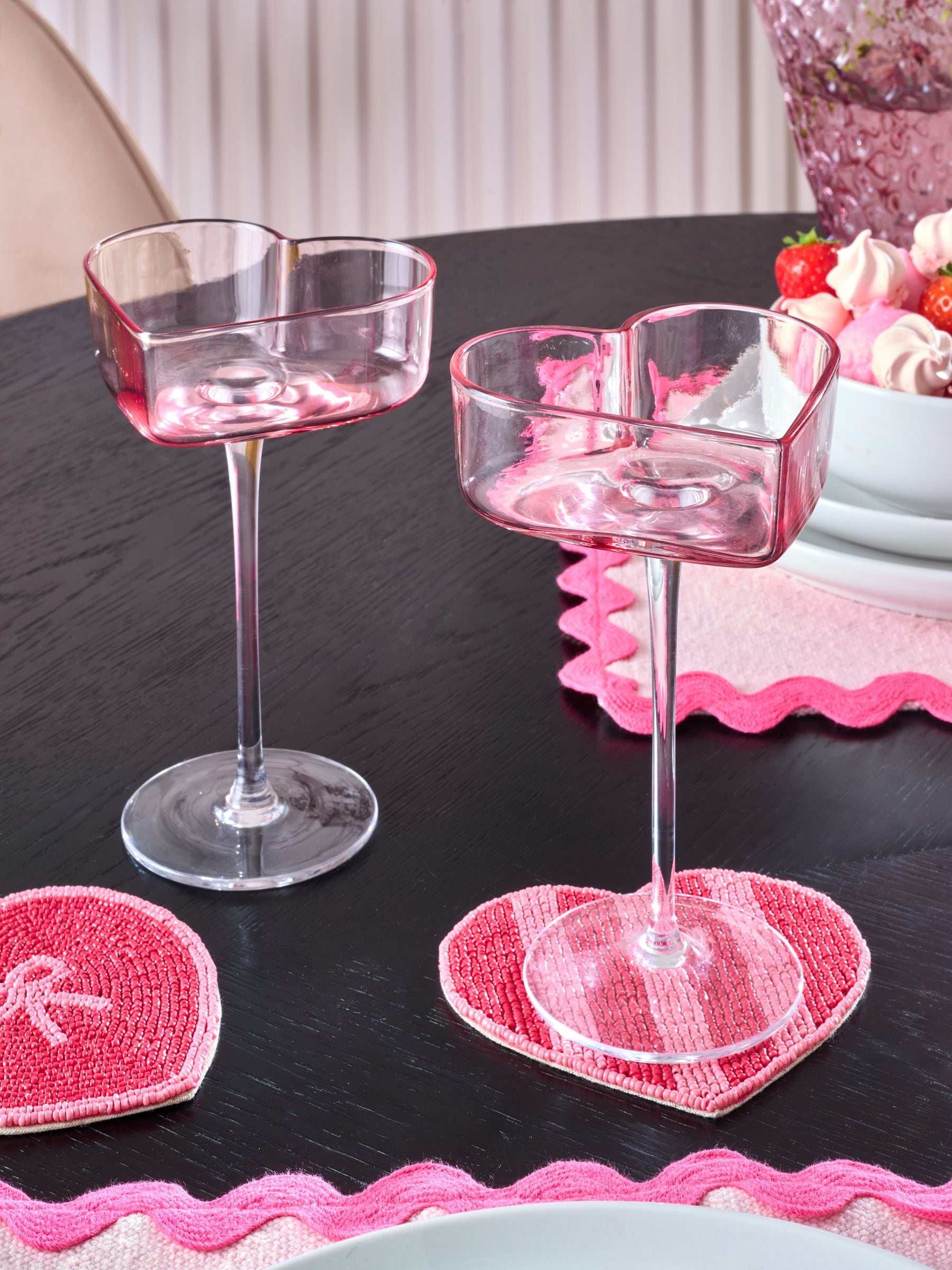 Toasting to special moments just got a whole lot sweeter with our set of two pink heart champagne saucers. They add an adorable twist to your toast and they're just as fun to use for sipping bubbly and cocktails as they are for a charming décor statement. With their lovely blush hue, these glasses are a must-have for anyone who loves a touch of class in their homeware.