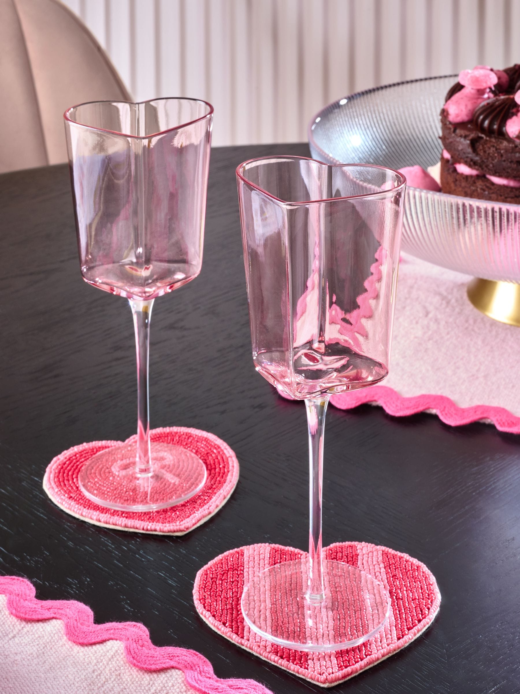 Toasting to special moments just got a whole lot sweeter with our set of two pink heart wine glasses. They add an adorable twist to your toast, and they're just as fun to use for sipping bubbly and cocktails as they are for a charming décor statement.