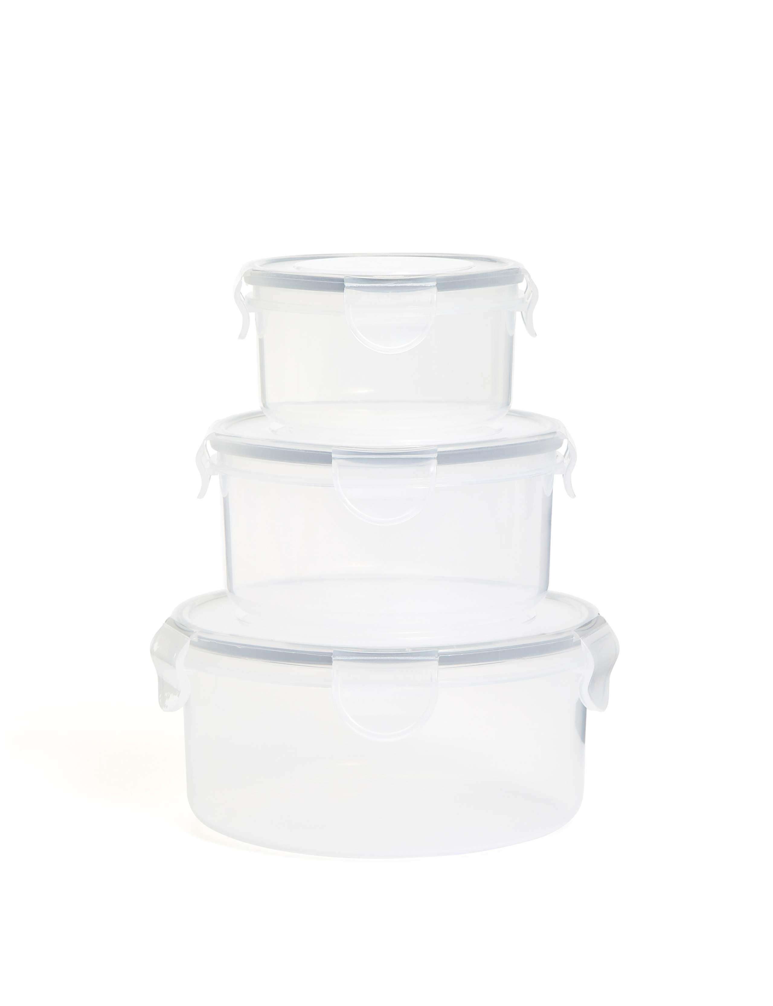 Read MoreSave on space and waste in the kitchen with this handy storage set. These round plastic containers are perfect for storing leftovers in the cupboard or fridge, with secure clip fastenings to prevent spills. Designed in three different sizes, each one is clear for easy use. They are dishwasher-safe too, so you can use them again and again.