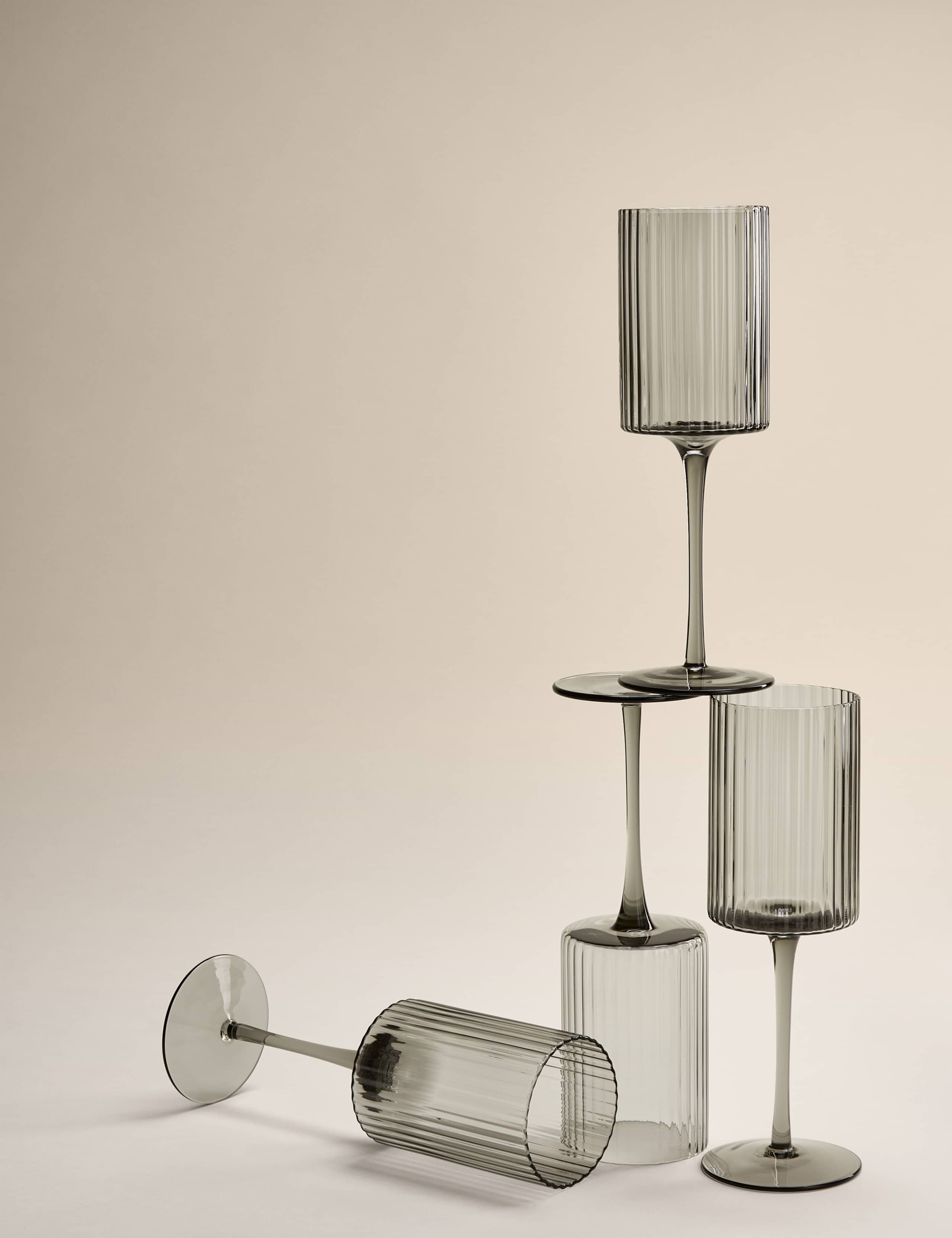 These wine glasses add a level of sophistication to any dining occasion. This is a complete set of four glasses, ideal for entertaining guests or daily use. Each piece features a striking, contemporary silhouette crafted entirely from ribbed glass for visual texture. Maintenance is straightforward, as these glasses are designed to be conveniently dishwasher-safe after use. This set combines aesthetic appeal with practical functionality for your table setting.
