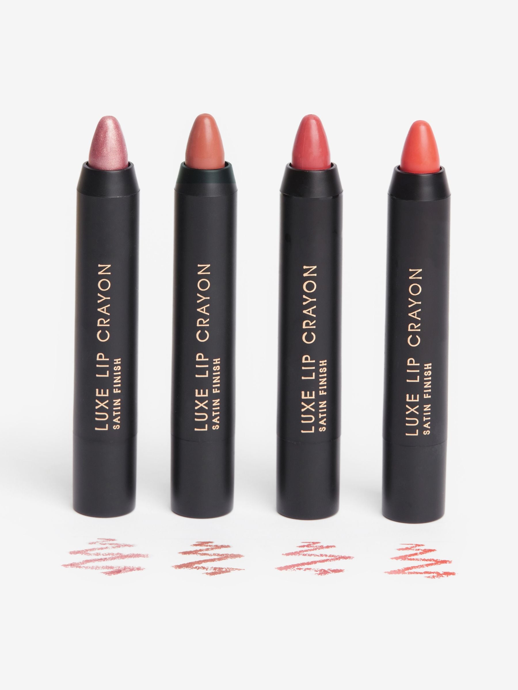 Set of 4 multi-use nude lip crayons in a selection of complementary shades in a soft touch, satin finish. These multi-use lip crayons act as both lipstick and lip liner in one, perfect for creating a beautiful lip look on the go.