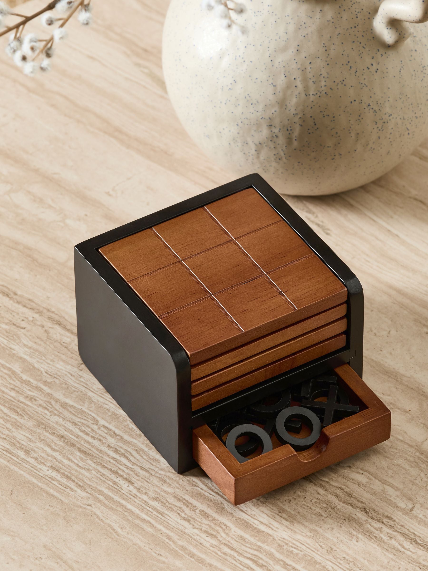 These coasters double up as coasters and a fun noughts and crosses board game! The 4 wooden coasters sit neatly on the holder and feature the grid to play, with the playing pieces in the drawer section underneath.