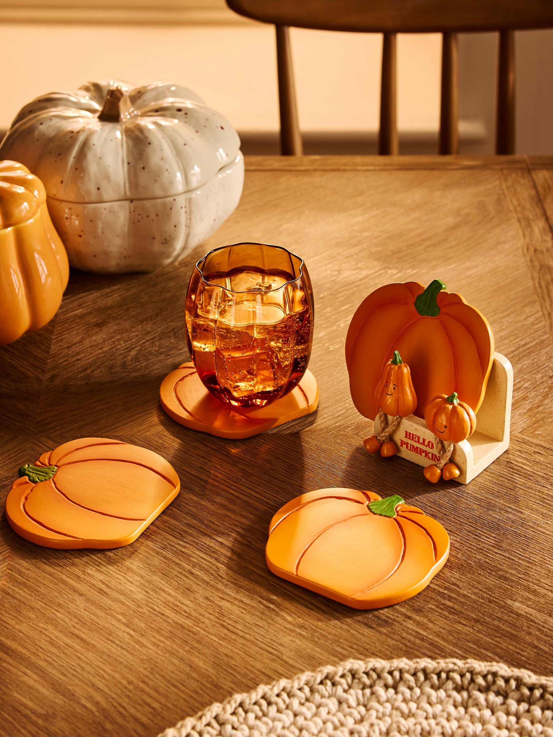 Add some autumnal character to your living space with this set of 4 pumpkin coasters. Complete with holder, these coasters can be stored away when not in use.