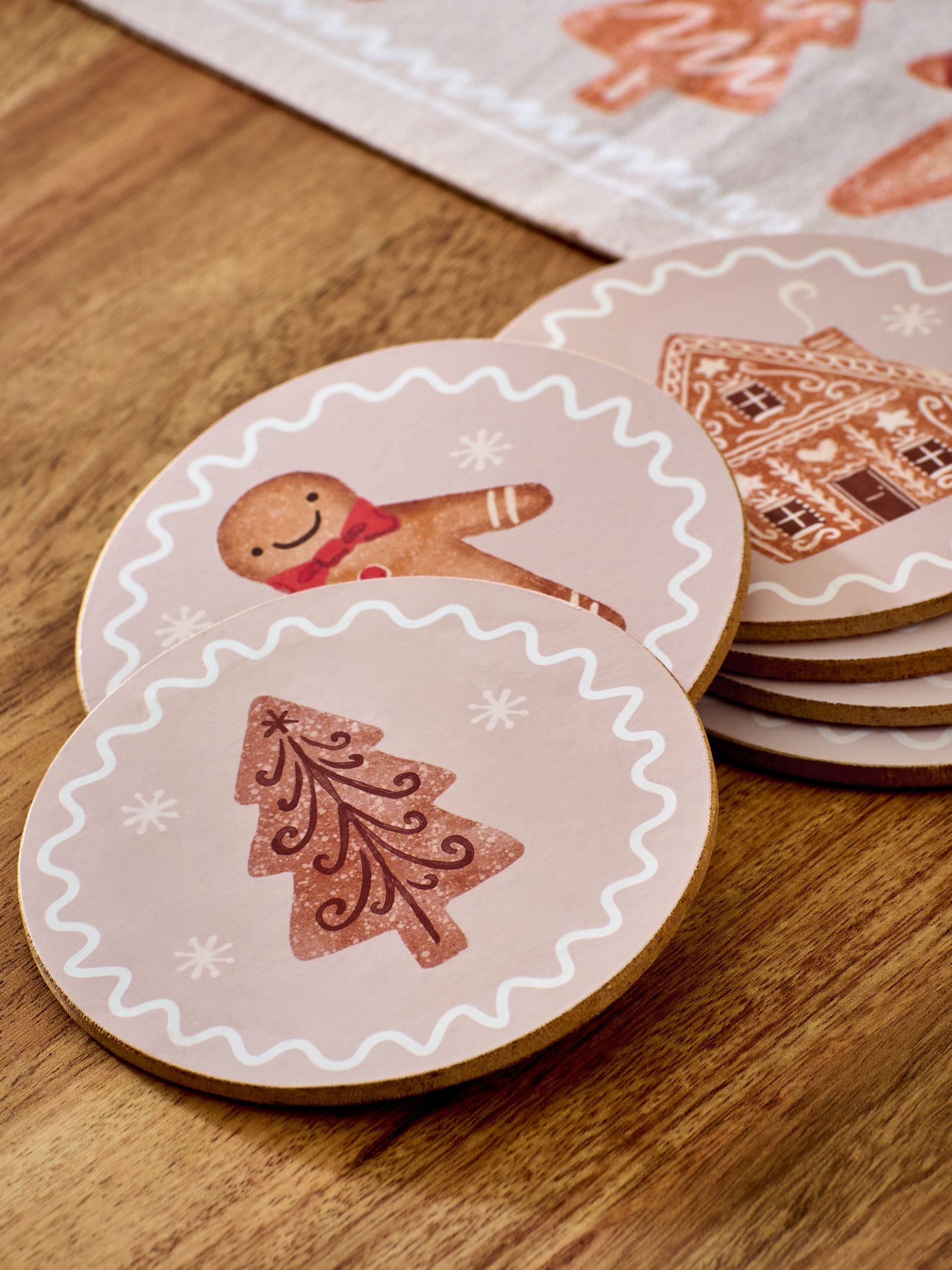 Add a touch of holiday magic to your tabletops with our set of 6 gingerbread-printed corkback coasters.