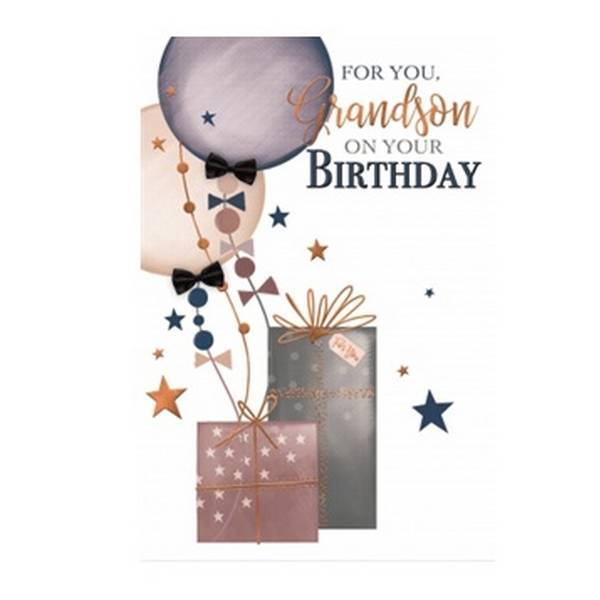 Material: Card. Design: Balloon, Present, Printed, Stars, Text. Contents: 6 Envelopes. Occasion: Birthday. Card Recipient: Grandson.
