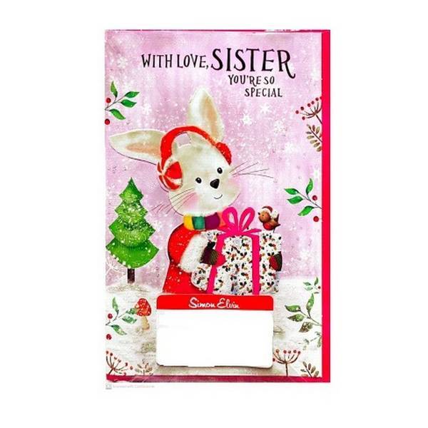 material card design cat christmas tree present printed rabbit text occasion christmas open wrapped card recipient sister