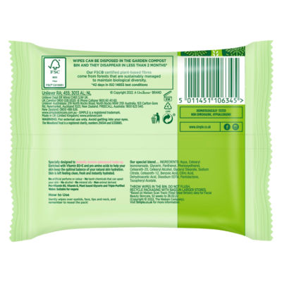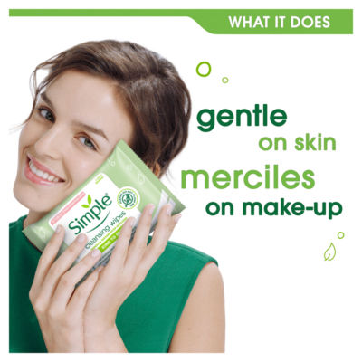 FeaturesSimple Kind to Skin Cleansing Facial Wipes lift away dirt, impurities and remove make-up effectively, even waterproof mascara, while being gentle on your skin. These cleansing wipes leave no greasy residue, instantly refresh and hydrate your face, leaving skin feeling fresh and clean. New aqua-lock technology prevents the face wipes from drying out so even the last wipe is as fresh as the first. Our Simple cleansing wipes are made with softer-than-silk fibres, gentle cleansers, triple-purified water and skin-loving ingredients such as vitamins B5 and E. Dermatologically tested and approved, these hypoallergenic facial wipes are unscented and contain no artificial perfume or colour, no alcohol, and no harsh chemicals that can upset your skin. These face wipes are vegan and Simple is certified Cruelty-Free by PETA – we don't test on animals anywhere in the world.
