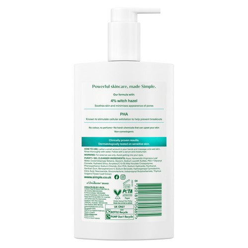 Clear Skin, Every Day: Simple Purify+ Gel Facial Cleanser is powered by witch hazel, zinc and PHA to reduce oil, unclog pores and help prevent breakouts - for clean skin, every day, For Visible Results: This clarifying facial wash effectively cleanses and controls oil, leaving your skin visibly clear, refreshed and mattified, Works with Skin's Own Biology: Working with your skin's own biology, the cleanser soothes, exfoliates and supports your skin's natural renewal processes for a healthier complexion, Efficacious Textures: Our lightweight gel cleanser produces a gentle lather that delivers a refreshing clean without drying out your skin, Dermatologically Tested: This face wash alternative is dermatologically tested on sensitive skin to ensure it's effective, safe and suitable for all skin types, Thoughtfully Formulated: Formulated with skin-friendly ingredients, Simple face cleansers are vegan-friendly and free from perfume, colour and harsh chemicals
