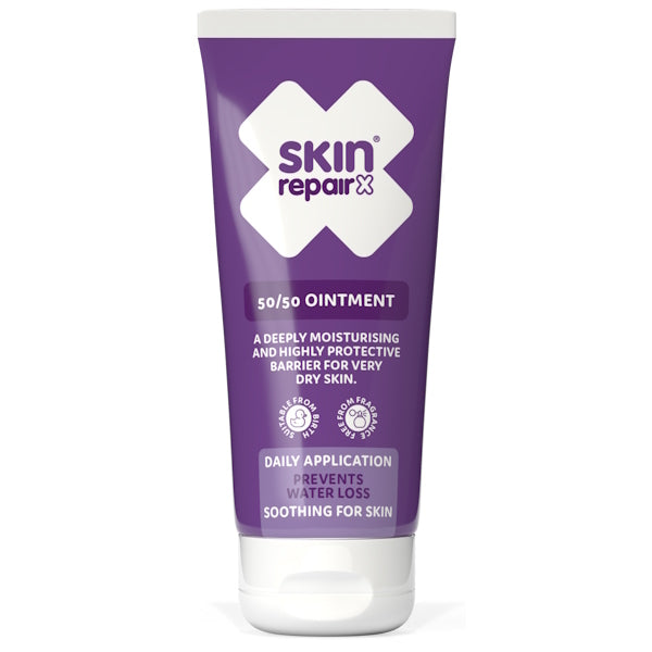 This SkinRepairX 50/50 Ointment provides treatment for various dry skin conditions, including eczema, dermatitis, and psoriasis. It is formulated to offer comfort by alleviating uncomfortable symptoms such as redness, itching, and scaling. The ointment functions by creating a beneficial protective layer over the skin.