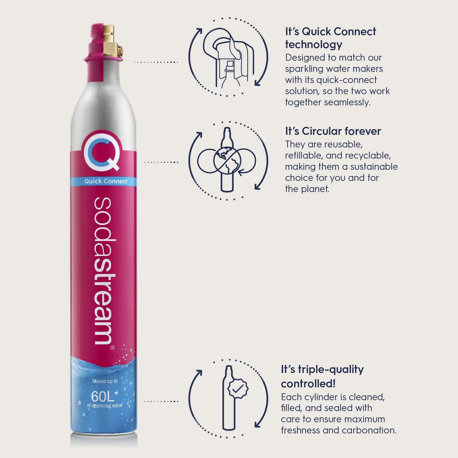 This Sodastream cylinder features patented Quick Connect technology for easy installation into compatible sparkling water makers. It contains 425g of E290 carbon dioxide, which is food grade and Kosher certified. This refill typically allows users to create up to 60 litres of sparkling water, though this varies by carbonation level.