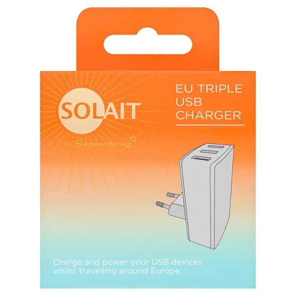 This Solait EU Triple USB Charger is designed as a convenient power solution for travellers navigating Europe. It allows you to efficiently charge multiple USB devices simultaneously from one wall socket, reducing the need for multiple adaptors. The unit features a compact build, making it easy to pack alongside your essential electronics.