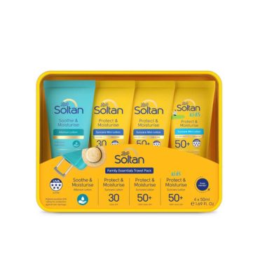 Read MoreOur Family Essentials Travel Pack is a comprehensive skincare solution for your travels. It includes Soltan Kids Protect & Moisturise Lotion SPF50+ in a 50ml container, alongside the same high-protection formula for adults in both SPF30 and SPF50+ options. Additionally, the pack contains Soltan Soothe & Moisturise Aftersun Lotion in a 50ml tube, perfect for post-sun exposure care.