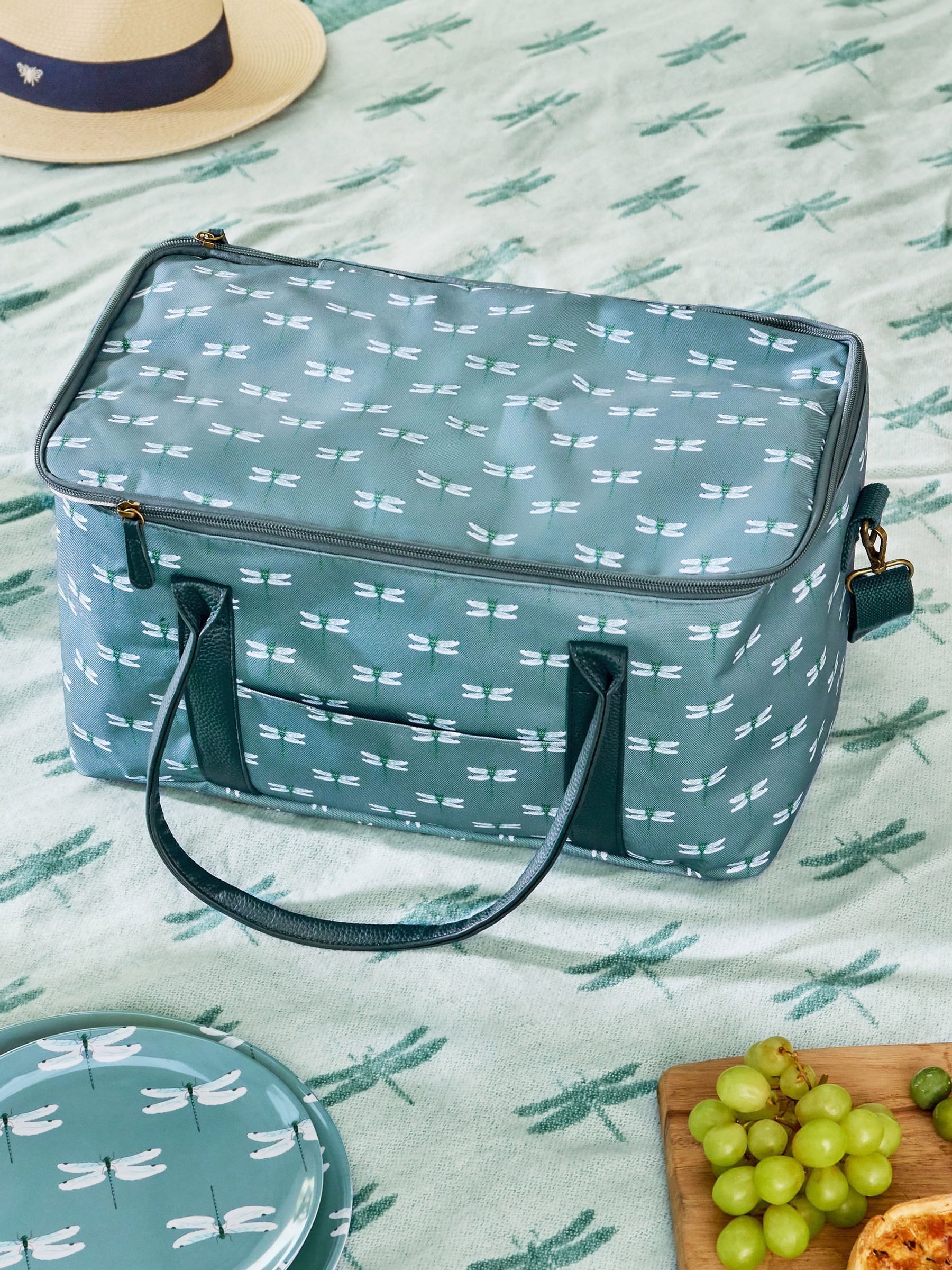 Enjoy picnics in style with this beautifully illustrated dragonfly picnic bag. Designed with a grey-blue backdrop, it’s ideal for beach trips, countryside strolls, or relaxed garden lunches. alfresco meals for two. Part of the Dragonfly Collection H 22 x W 40 x D 24cm Made from polyester 22 litre capacity Thick thermal insulation Front pocket for essentials Dual zip fastening Wipe Clean Two teal faux leather handle straps One teal adjustable cotton woven shoulder strap All products are made from rolls of fabric with a pattern repeat design. This means the design featured on each item will vary.
