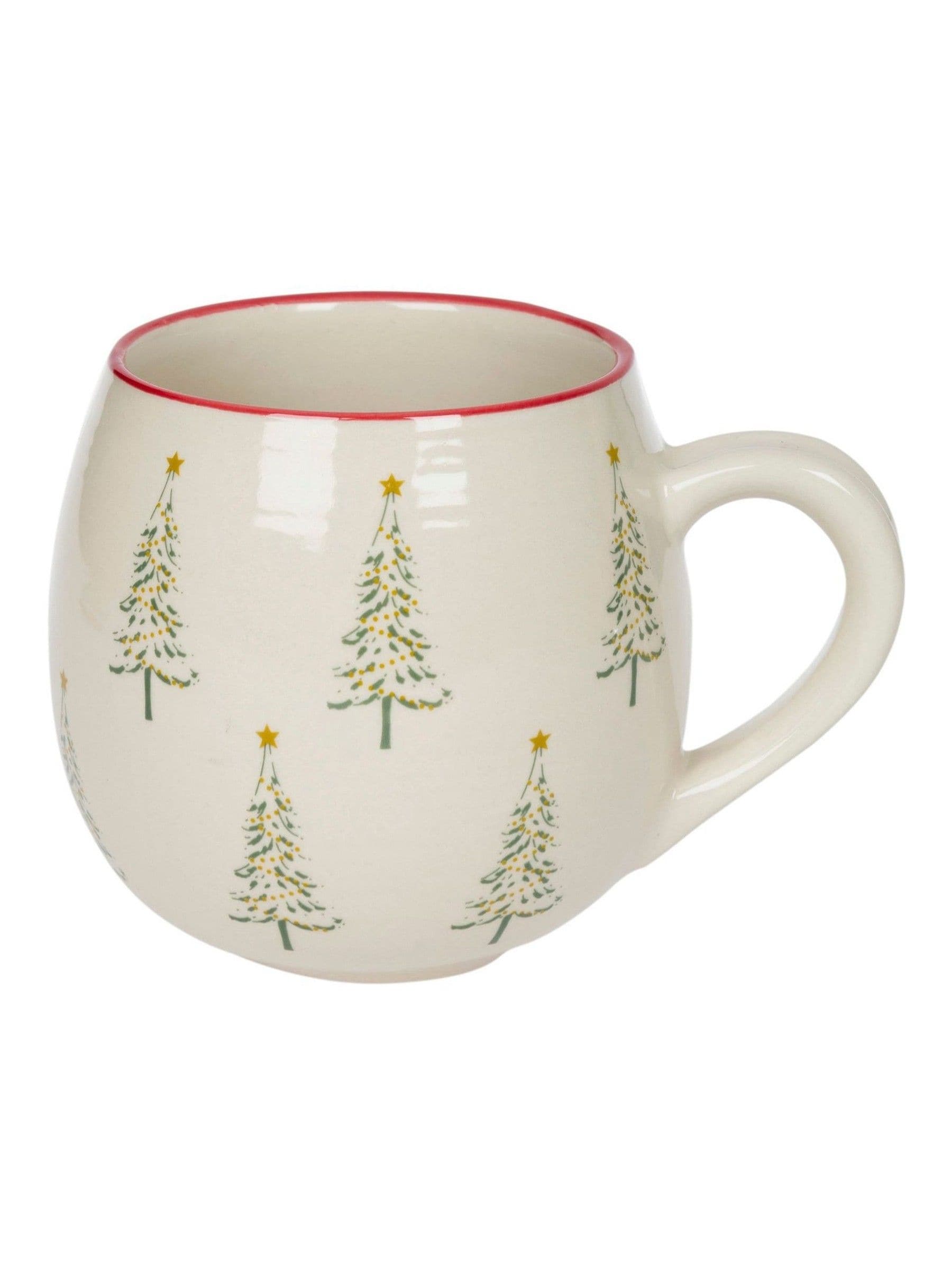 Enjoy your favourite festive drinks in this beautifully designed stoneware mug. Adorned with delicate Christmas trees topped with stars, it adds a seasonal charm to every sip. Pair it with matching pieces for a complete Christmas table setting. 500ml capacity H 11 x W 15 x D 12cm Made from durable stoneware Contrasting red rim Pattern may vary slightly Part of the Christmas Trees collection