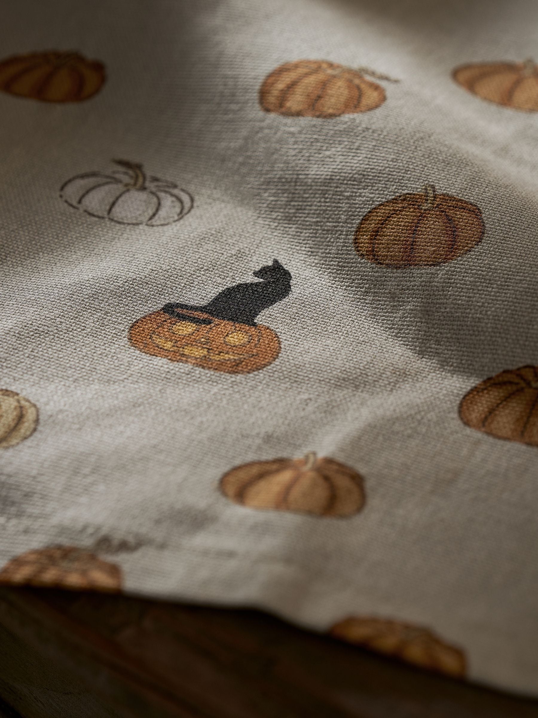 Create a Halloween table setting with these elegant cotton napkins featuring Sophie s hand-drawn golden orange coloured pumpkins and sleek black cats. Sold as a set of four, these seasonal essentials add sophisticated charm to autumn gatherings, from spooky dinner parties to cosy family celebrations. Set of 4 H 41 x W 41cm Made from 100% cotton Pattern may vary slightly Coordinating items are available in the Halloween collection