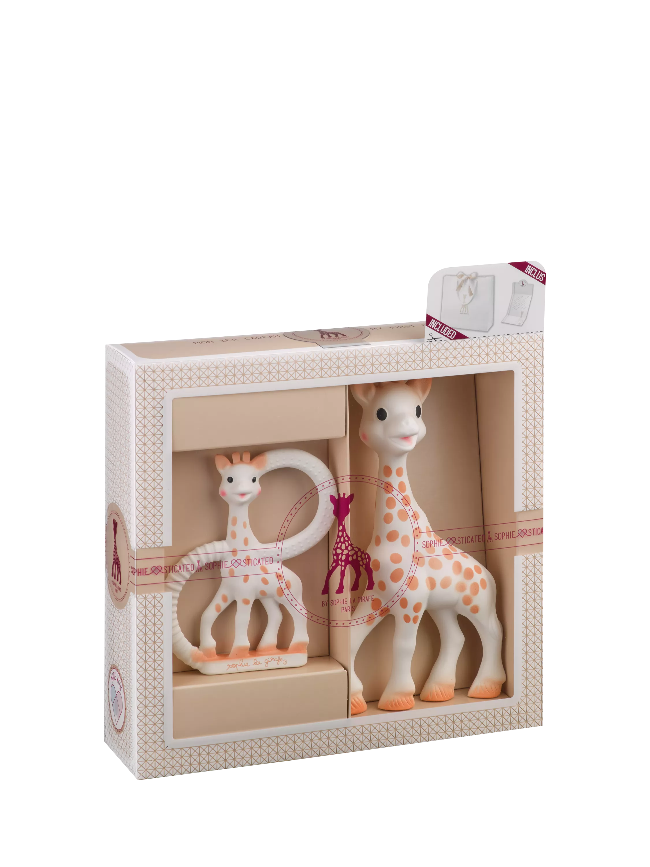 Made with love, this beautiful gift set features two of the range's best loved products, an Original Sophie la girafe and a So Pure Sophie la girafe teething ring. The original Sophie la girafe is a popular classic teething toy made from 100% natural soft rubber; it is slender, flexible and soft, so your baby can squeeze and chew it safely.