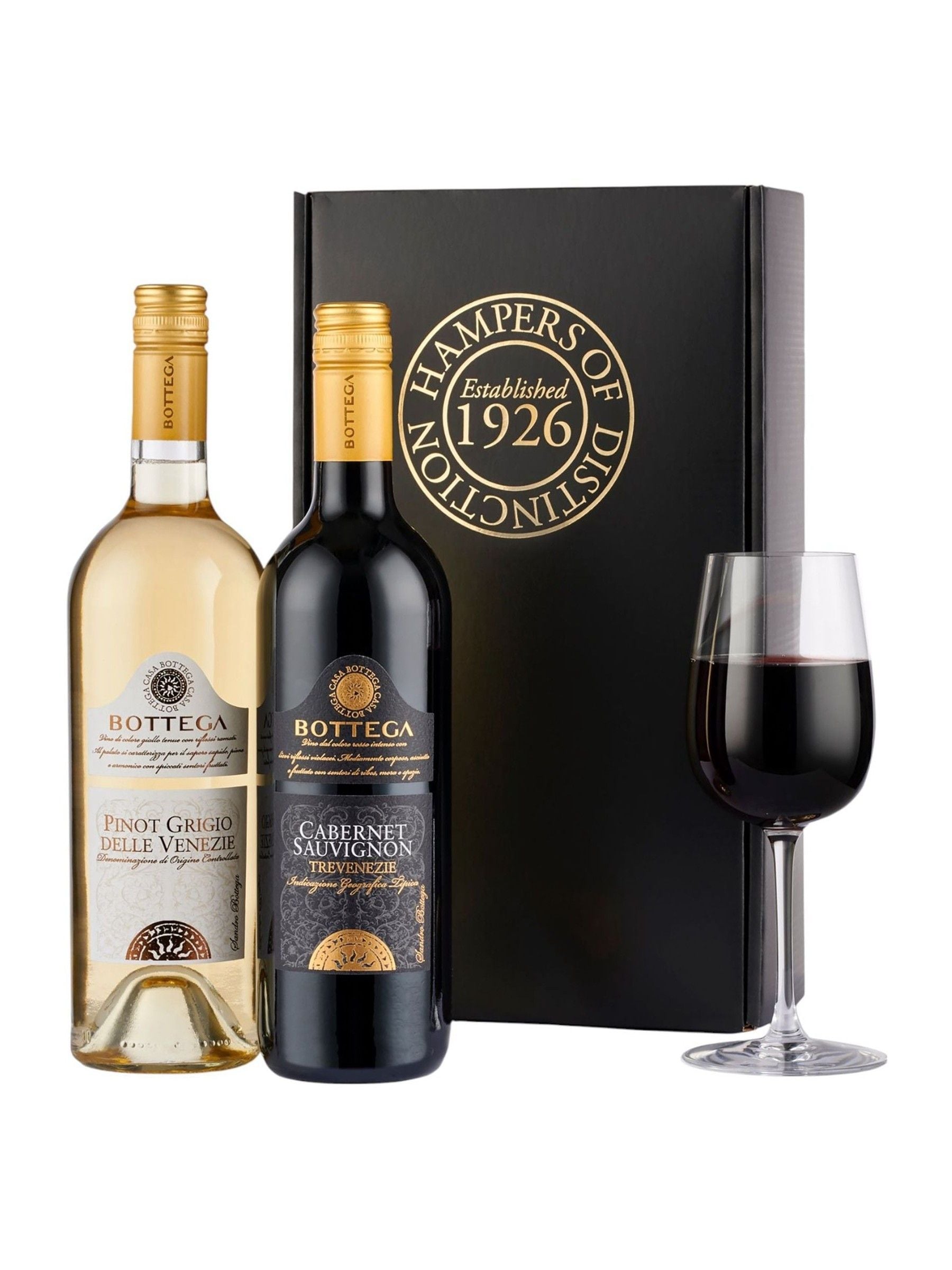 Bottega Cabernet Sauvignon 75cl. Bottega Pinot Grigio 75cl. Packed in a Black Gift Box.