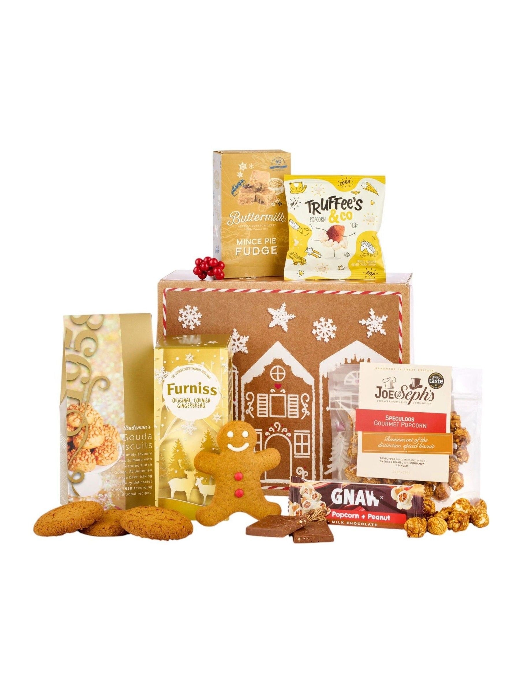 Truffees & Co Popcorn Truffles 35g Joe & Seph's Speculoos Popcorn 32g. Buiteman Gouda Biscuits 75g. Original Biscuit Bakers. Gingerbread Jack Biscuits Gnaw Peanut & Popcorn Milk Chocolate. Impulse Bar 35g. Furniss Gingerbread 160g. Buttermilk Mince Pie Fudge 100g. Packed in a Gingerbread House Gift Box.