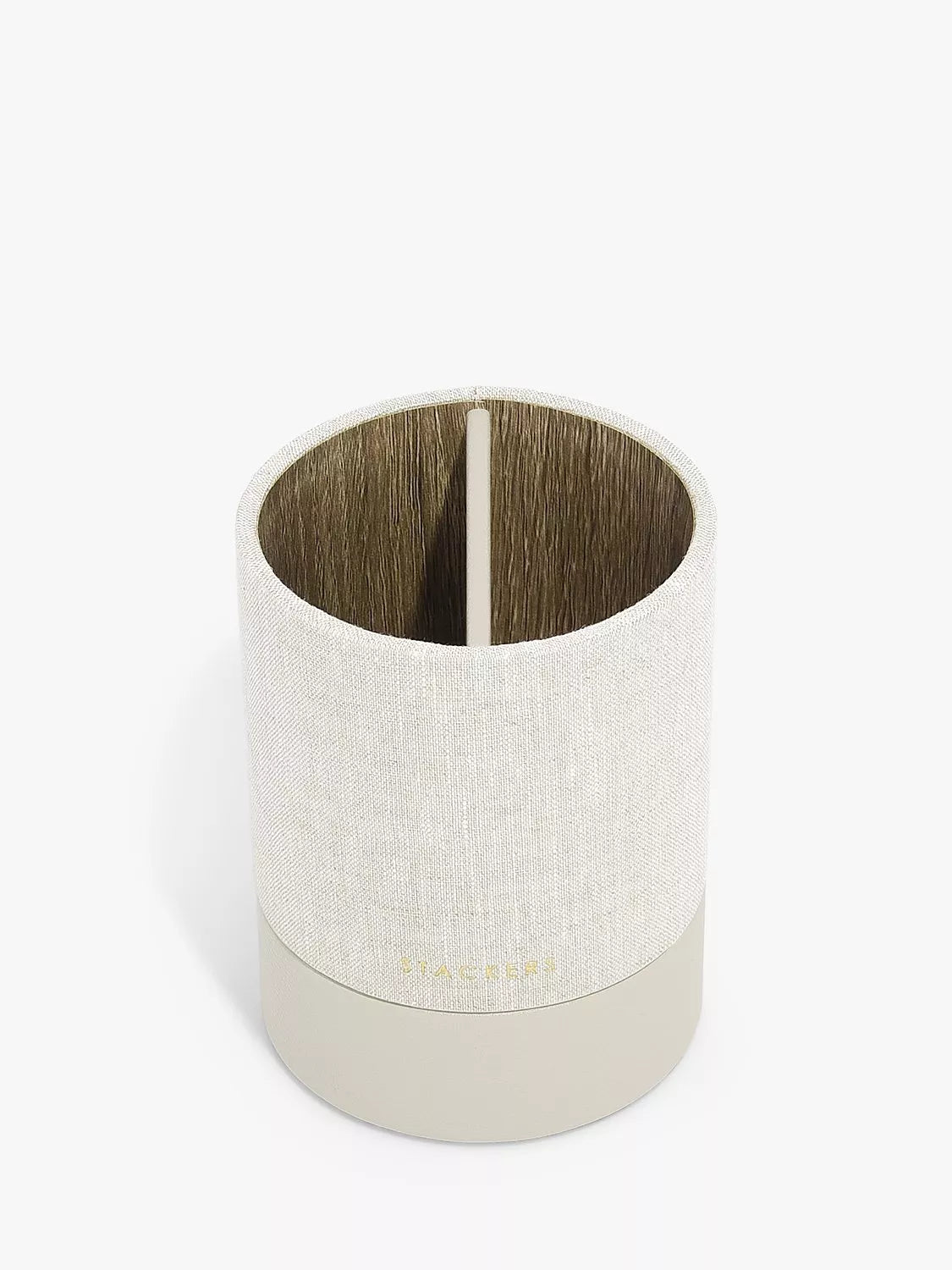 Keep your desk tidy with the Stackers Stationery Pot, a simple addition that can help to declutter your home office by keeping stationery organised and easy to find. Underneath is a hidden tray for small stationery items. Finished in a neutral Oatmeal PU and Linen mix, to complement your home office aesthetic.