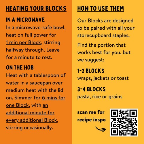 Our delicious dishes are frozen into handy little Blocks, allowing you to choose your own portion each time, and serve them with store cupboard staples like rice, wraps, pasta and baps!