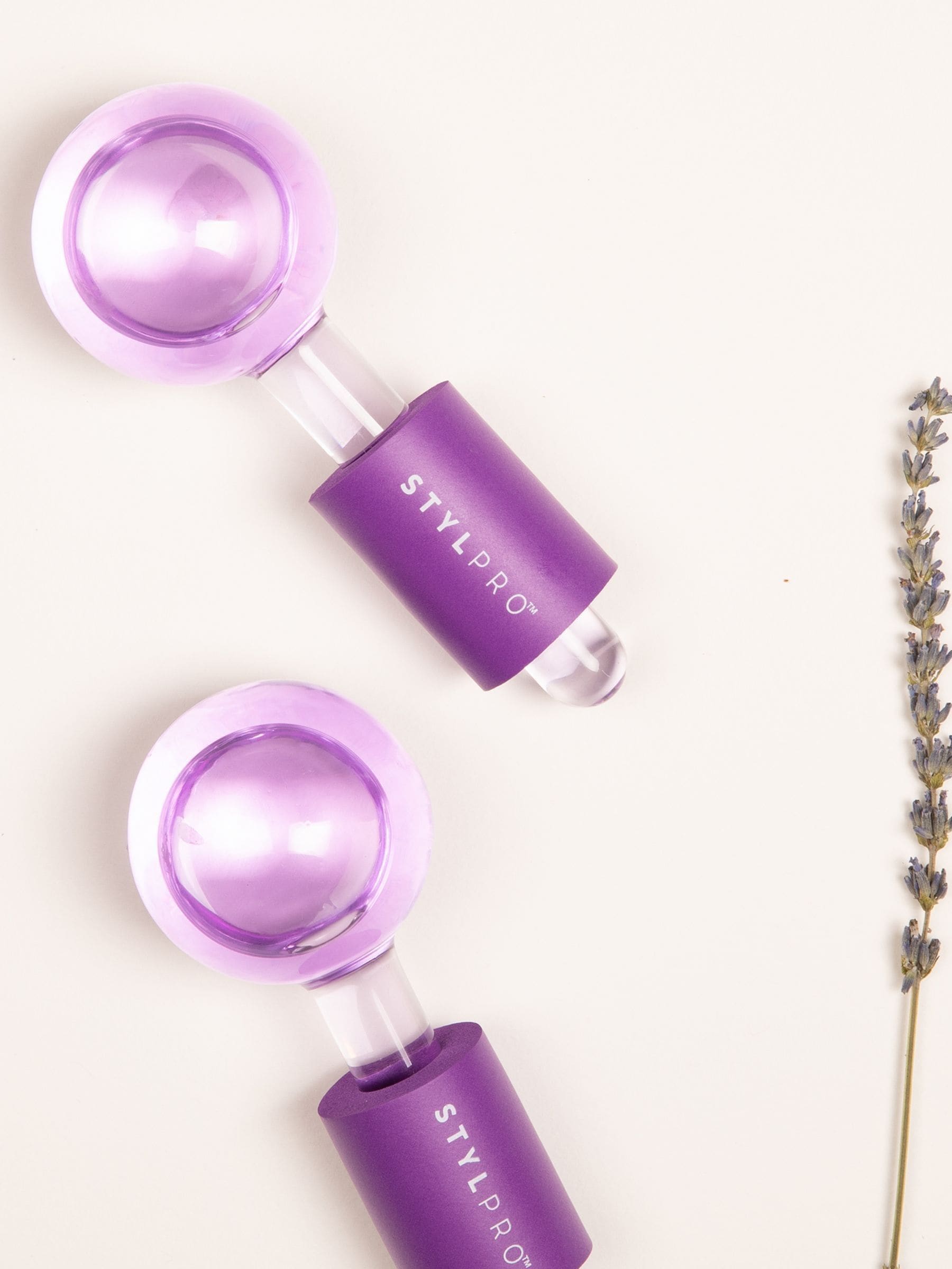 STYLPRO Ice Globes are a set of 2 cryotherapy facial massage rollers, using the cooling powers of icy temperatures to lift complexion, enhance circulation, reduce eye circles, and drain lymph nodes. Embrace beautifying benefits of the cold with STYLPRO Facial Ice Globes. Massaging your face with our icy globes refreshes skin by reducing redness, puffiness and enhancing circulation. Cryotherapy invites the skin to absorb moisture for intense hydration and firming. Massaging with icy temperatures encourages lymphatic drainage for natural relief to headaches and sinuses. Keep in the freezer or fridge and glide smoothly over your face for restored and revived skin. Serve perfect skin over ice with STYLPRO.
