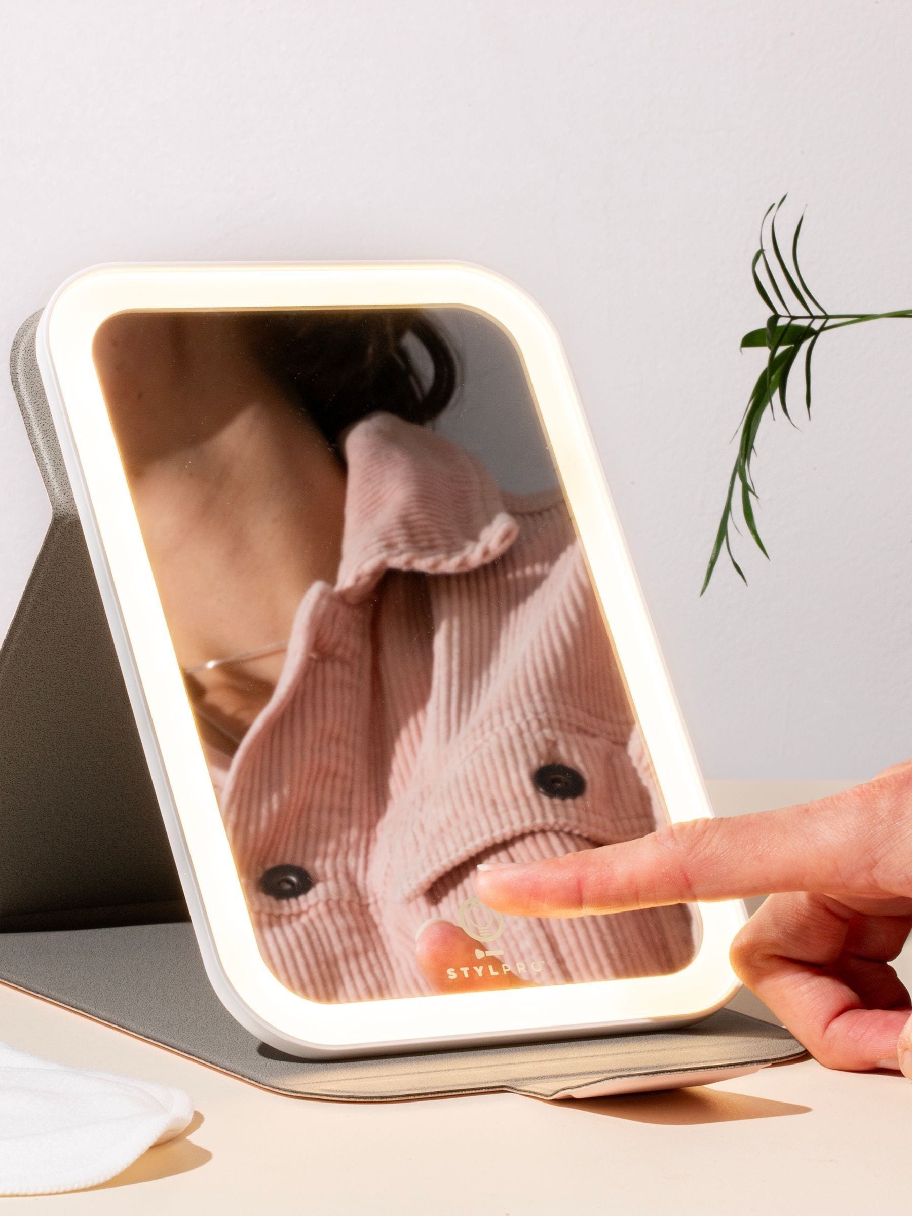 STYLPRO On Tour Mirror is a lightweight, slimline, and portable mirror, lined with dimmable LED light panels for the perfect lighting when applying makeup. SHINE BRIGHT, TRAVEL LIGHT Turn every touch-up into a full glam experience with the STYLPRO On Tour Petite Travel Mirror. Getting ready on the go doesn’t have to be a tricky process; instead, let our super-handy travel mirror make the whole thing a breeze. This portable, lightweight travel mirror has a fold-flat protective case that doubles as a vertical or horizontal stand, and it’s also equipped with built-in LED lights so you can see exactly what you’re doing whatever time of day it is. Choose from 3 dimmable (just press and hold) light settings – bright, warm, and cool – that you can switch between easily with just a few taps. Better yet, the mirror is Micro-USB rechargeable (cord is included), so there’s no need to worry about replacing any batteries.