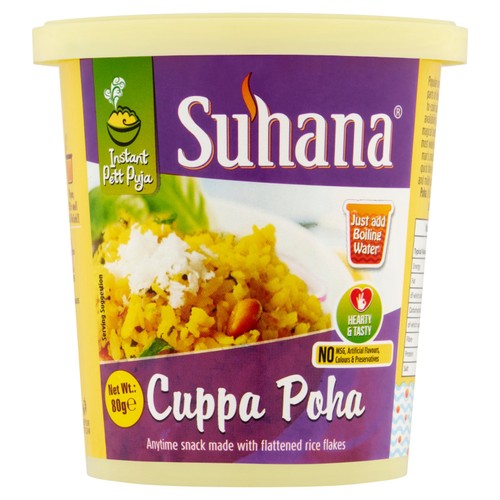 Popular in western and central parts of India, Poha is an easy- to-cook nutritious snack. Easy availability, affordability and its magical taste has made Poha the most widely acceptable common man's snack. Get the tasty and quick bite of perfectly flavored and mildly spiced Suhana Cuppa Poha. It is indeed amazingly satisfying!!