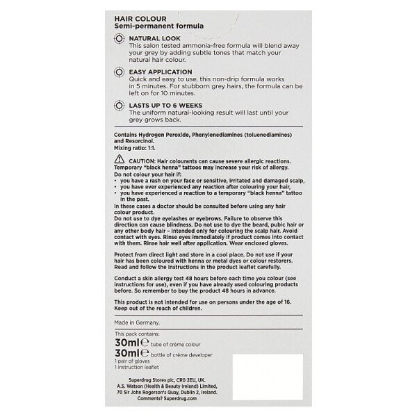 Conceal grey hair effortlessly with Superdrug Colour For Men Dark Blonde 7.0, a salon-tested ammonia-free hair colour. This easy-to-use formula delivers natural-looking results in just 5 minutes, lasting up to 6 weeks.