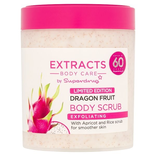 superdrug extracts dragon fruit body scrub is formulated with dragon fruit extract apricot and rice scrub particles to help exfoliate dead skin cells revealing smooth skin