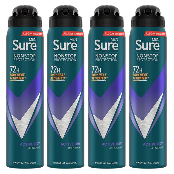 includes sure men antiperspirant deo aerosol nonstop active dry 250ml x4