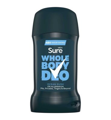 Read MoreStay fresh all over with Sure Men Ocean Rush Whole Body Deodorant. This aluminium-free deodorant for men provides 48 hours of odour control so you can overcome your limits. Our whole body deodorant features Sure’s patented Body Adapt Technology, which stops odour before it even starts. This men's deodorant stick offers a herbal and woody scent with a clean, fresh feel. Its invisible formula feels light and refreshing, gliding smoothly on the skin to provide nearly instant freshness.