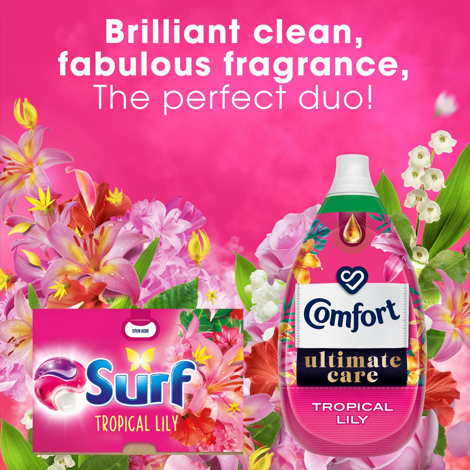 Our Surf Tropical Lily Laundry Capsules turn up the volume on joy in your day-to-day life, infusing your wardrobe with an explosion of floral sweetness that lasts from dawn to dusk. We’ve collaborated with top fragrance experts to bring you the joyful power of long-lasting tropical lily scent, infused with essential oils for up to 12 hours of in-wear delight. Our laundry detergent capsules dissolve fast even in quick and cold washes, delivering a brilliant clean with bursts of fabulous fragrance long after you’ve washed your clothes. You can rest assured your laundry will be brilliantly clean and fresh for longer with these dermatologically tested washing detergent capsules from the UK’s No.1 fragrance detergent brand**. Surf laundry capsules are easy to use, being both efficient and convenient for your busy life, and the box is recyclable and plastic free*. For best results, use one capsule for standard soiling, soft/medium water and a standard (3–5 kg) load. Use two capsules for heavy soiling, hard water or a larger (6–8 kg) load. Pair our washing capsules with Comfort Tropical Lily Fabric Conditioner for the ultimate long-lasting joy-infused experience. Say hello to vibrant, fresh-smelling clothes that spark joy with every wear. *excluding glues and varnishes **Source ©2023 NIQ data, Value / Unit Sales, Fabric Cleaning – Fragrance (client defined) w/e 17.02.2024 (GB)