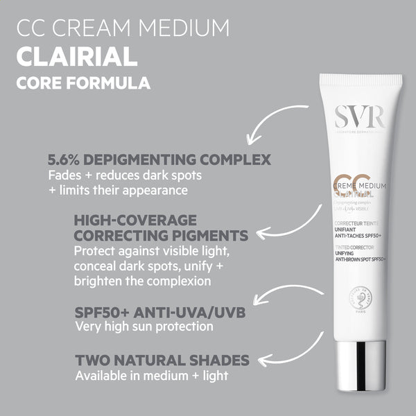 This SVR CLAIRIAL CC Cream provides 3-in-1 unifying colour correction for concerns related to dark spots and hyperpigmentation. Shade Medium instantly unifies the complexion while offering robust broad-spectrum sun protection against UVA, UVB, and visible light. The formula includes a 5.6% depigmenting complex designed to visibly fade existing spots and limit future discolouration.