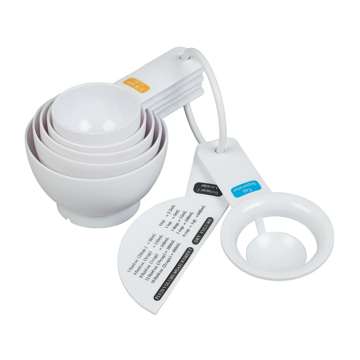 This Tala 7-piece Kitchen Measuring Set ensures precision when handling both wet and dry ingredients during cooking. The durable white measuring cups and spoons nest neatly together for streamlined storage efficiency. It is an essential component for any well-equipped food preparation area.