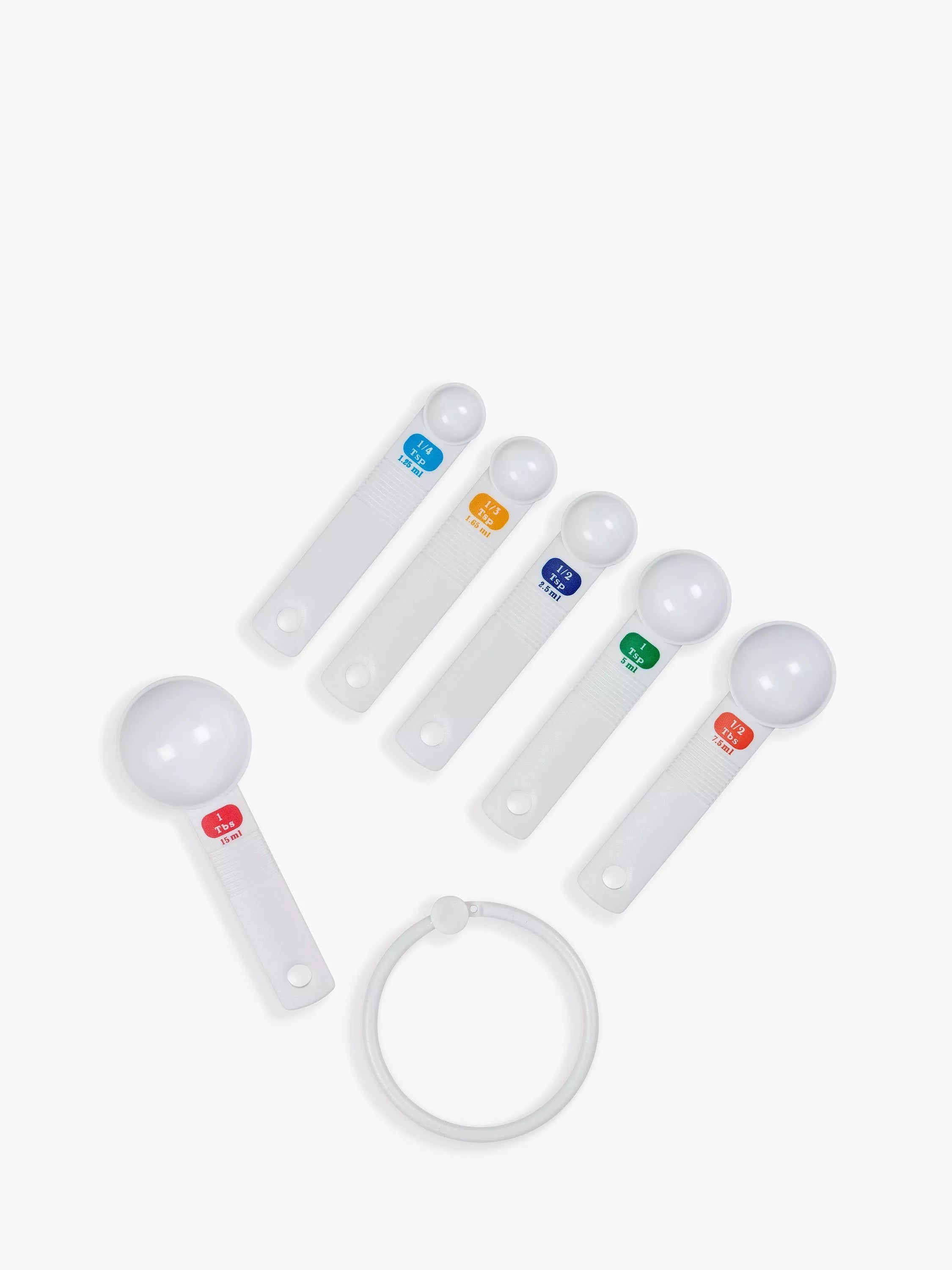 Six measuring spoons from Tala, for precision baking and cooking. They nest together for compact storage in a kitchen drawer and are held together on a ring. Dishwasher-safe for easy cleaning, they match the larger Measuring Cups from Tala, with colour-coded imperial and metric measurements on the handles.