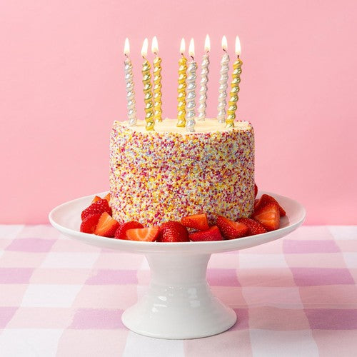 Read MoreAdd these gold twirl birthday candles to any birthday cake, cupcakes or brownies. Coming in a pack of eight candles, they come in shimmery metallic gold and are finished in a decorative twist shape, perfect for any age or gender.