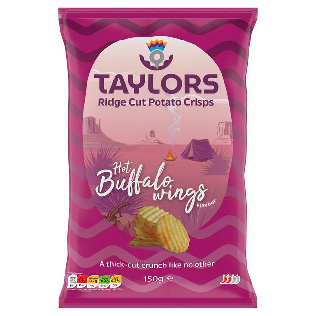 Experience the distinctive texture of Taylors Hot Buffalo Wings Flavour potato crisps. These snacks are crafted using extra thick slices for a satisfying, unique crunch every time. Based in Perthshire, the Taylor family uses gentle cooking methods to ensure the natural potato flavour remains prominent in every bite of these ridge cut crisps.