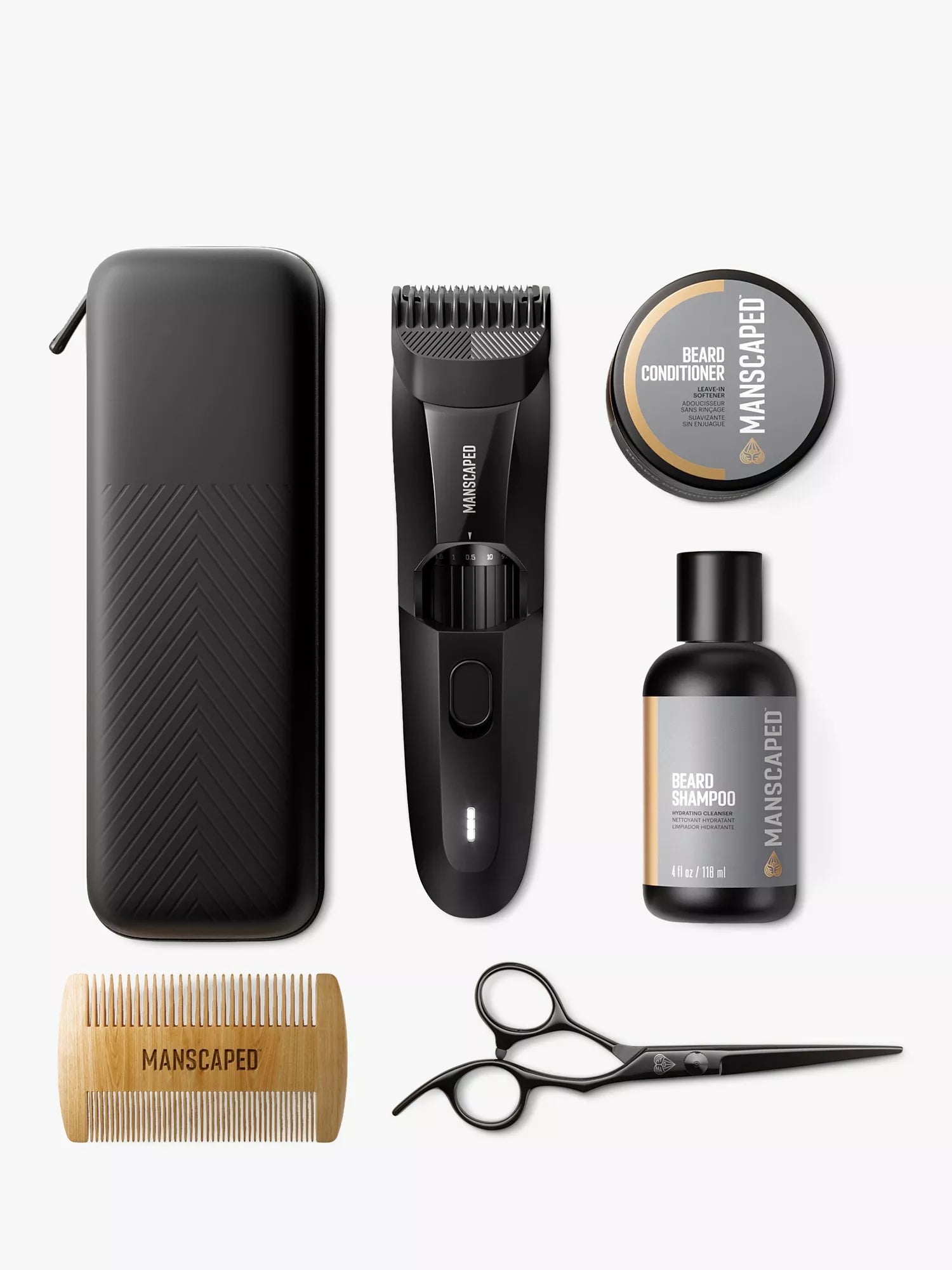 The Beard HedgerTM device, Beard Shampoo, Beard Conditioner, Beechwood Beard Comb, Beard Scissors, Trimmer Guide Comb, Charger, Adapter.