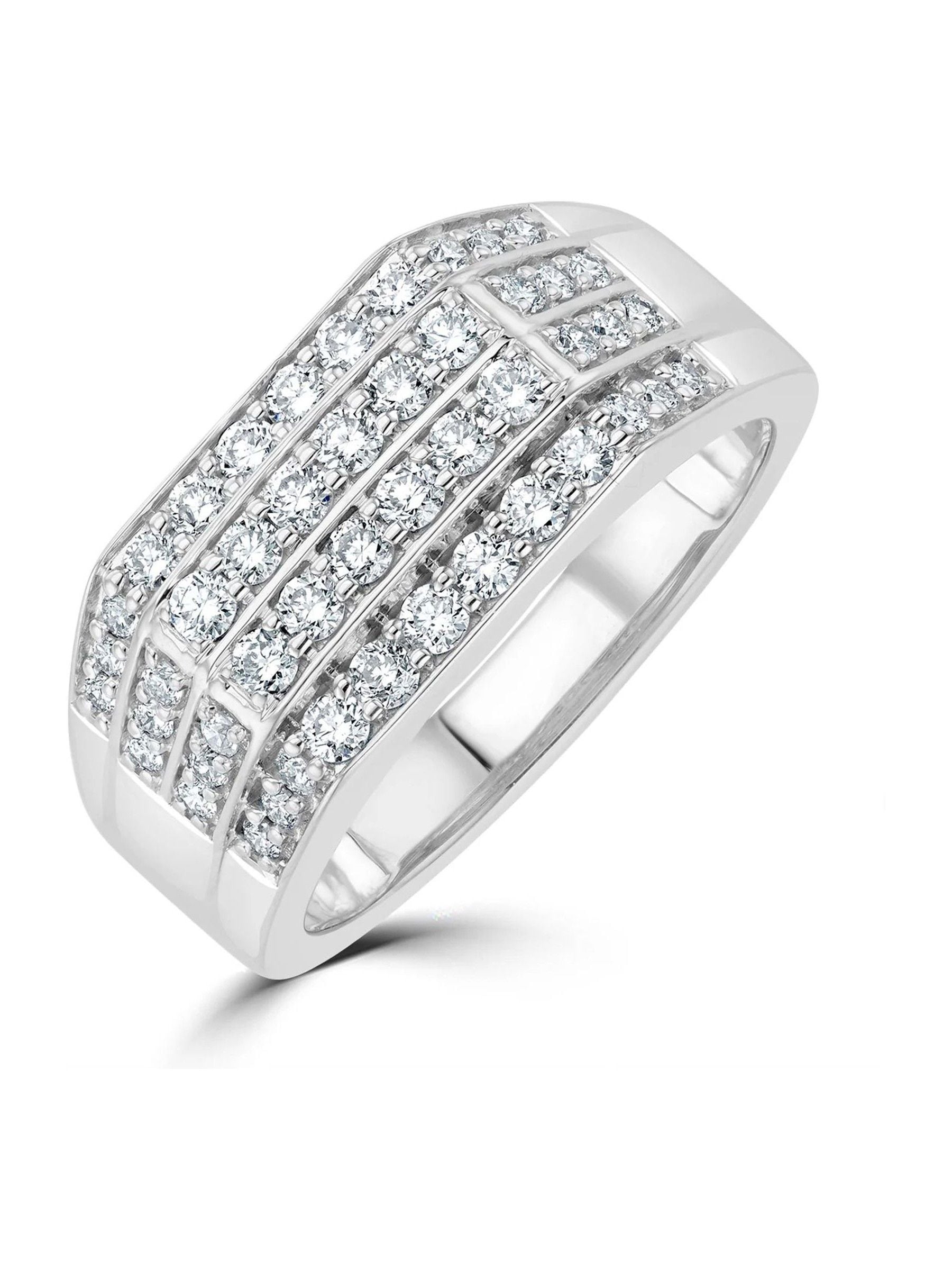 This bold men's diamond ring features a diagonal line of lab-grown diamonds, complemented by a unique metalwork pattern on the shoulders. Handcrafted in UK hallmarked sterling silver, it's polished to a high sheen that looks stylish and luxurious on the hand.