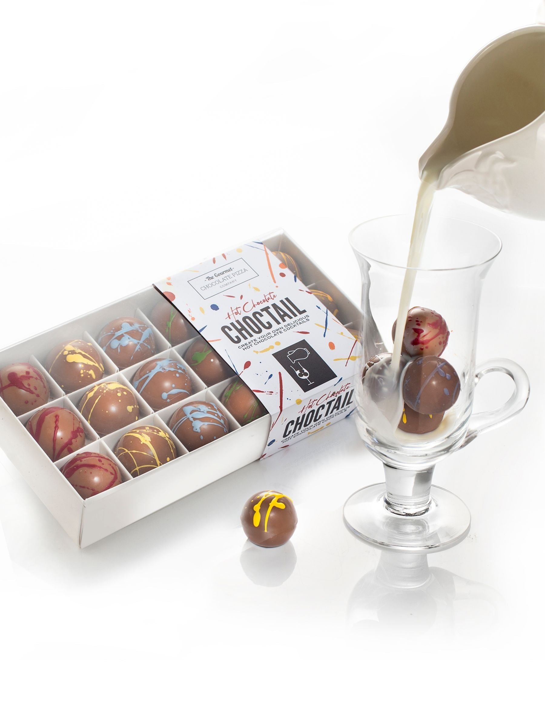 Introducing an exciting way for you to enjoy a bespoke hot chocolate experience! Simply mix and match the flavoured chocolate spheres to create your very own Hot Chocolate Choctail. Each pack contains 18 Belgian milk chocolate spheres, offering six different flavours, including Milk Chocolate,Chocolate Orange, Rum, Coffee, Irish Cream, and Salted Caramel. A recipe card is included in each box to help you find your ultimate Choctail experience. Creates up to four different hot chocolate drinks, depending on flavours and the number of spheres used.