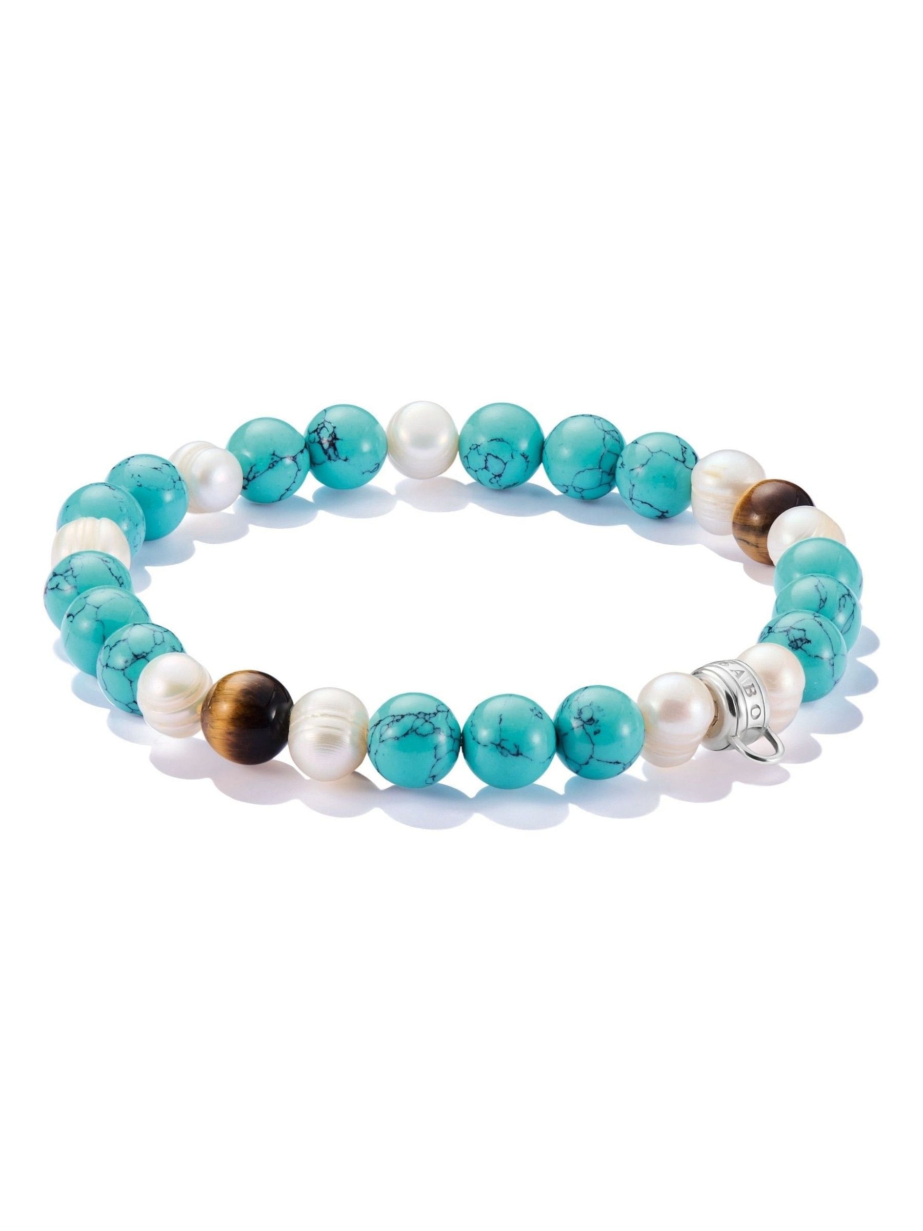 Charm Bracelets: Bead bracelet imitation turquoise, freshwater cultured pearl, tigers eye. This bracelet made from round-polished imitation turquoise, cultured freshwater pearl and tigers eye beads is a must-have for all fashion lovers. Available in lengths of 15 cm, 17 cm or 19 cm and an elasticated design to fit your wrist perfectly. Tell your story in your style!