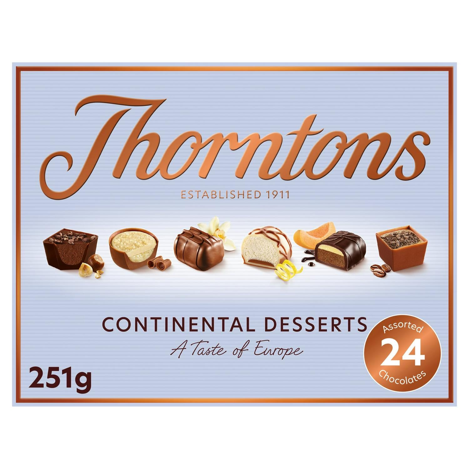 This Thorntons Continental Famous Desserts Box features a delightful assortment of milk, white, and dark chocolates. These selections capture the essence of classical European desserts crafted with great passion and expertise. Enjoy the distinct textures and aromatic profiles across this premium collection.