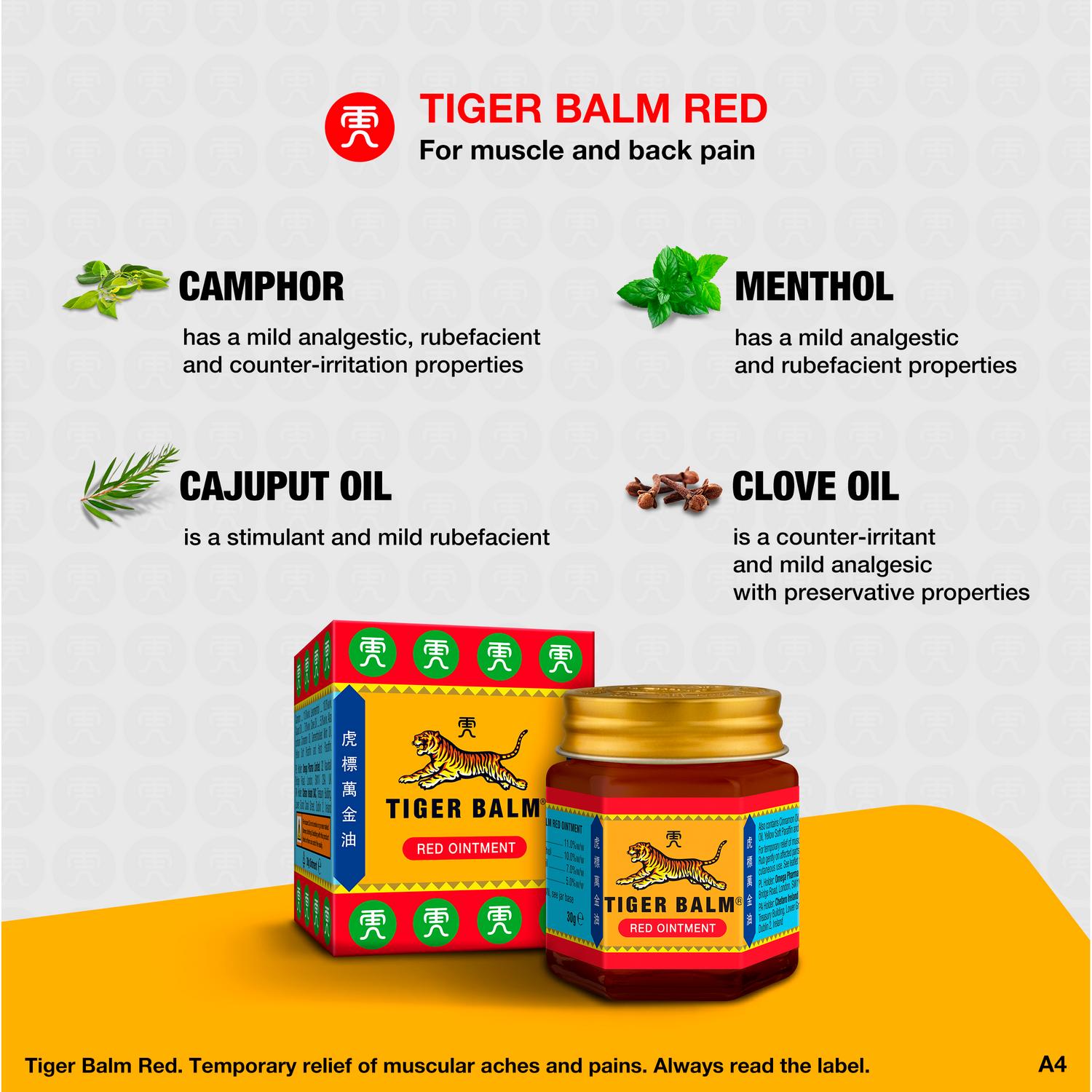 Tiger Balm Red Ointment (30g), Effective Herbal Pain Relief, for Muscle & Back Pain Effective relief from sore muscles and back ache, targets the source to help ease everyday aches and pains Scientifically proven heat therapy, easy to apply ointment delivers penetrating warmth to help soothe sore muscles Proven active herbal ingredients – the combination of Camphor and Menthol delivers a warming sensation that can improve blood circulation and provide mild pain relief Convenient travel-sized 30g jar – ideal for on-the-go use, offering access to pain relief, whenever you need it How to use – apply a thin layer of ointment to your fingers, then gently rub onto the affected area 2–3 times daily as needed