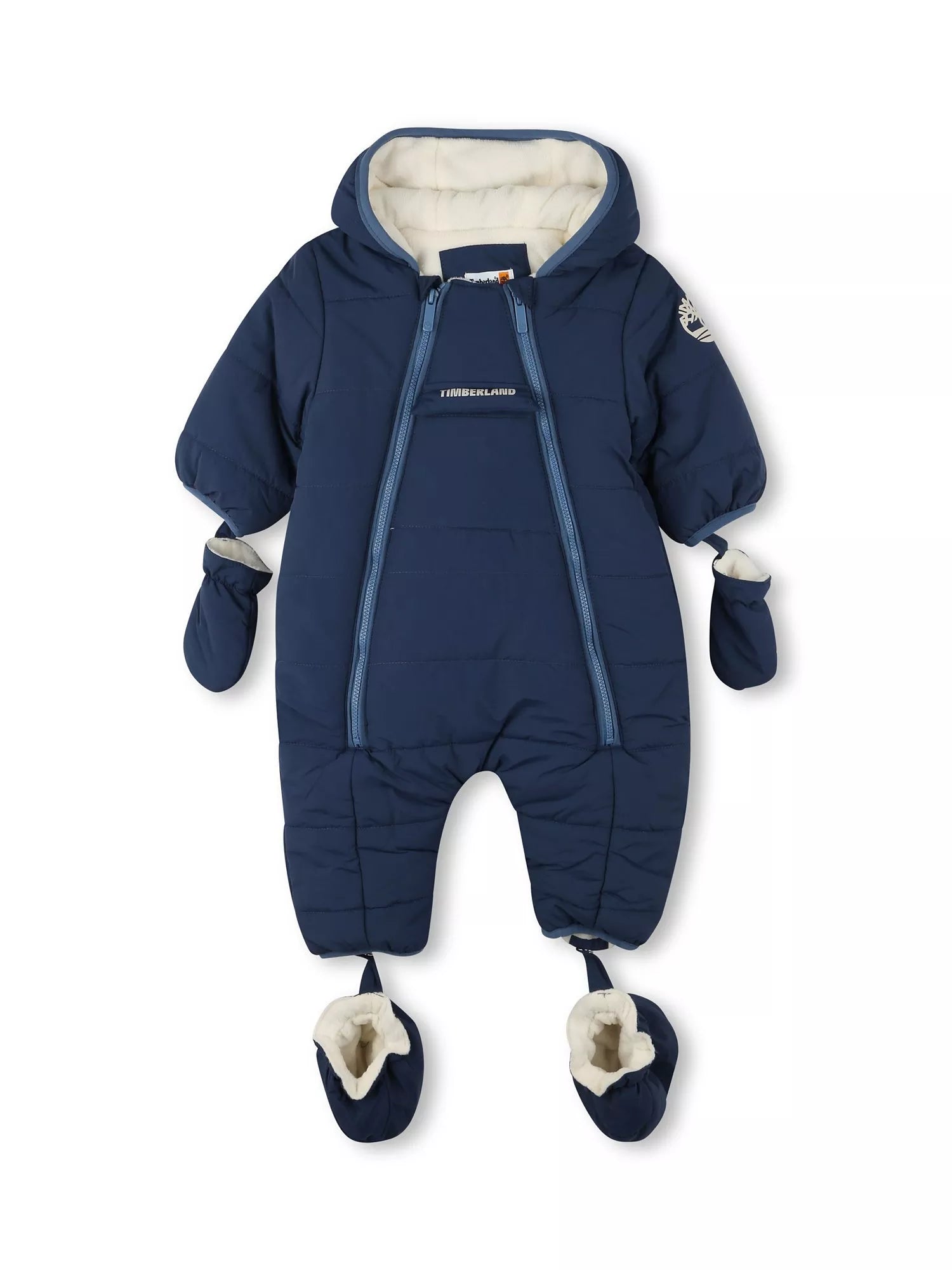 This water repellent snowsuit is lined with cosy faux fur. Designed with a matching hood, double zip closure and removable mittens and booties. Finished with Timberland branding.
