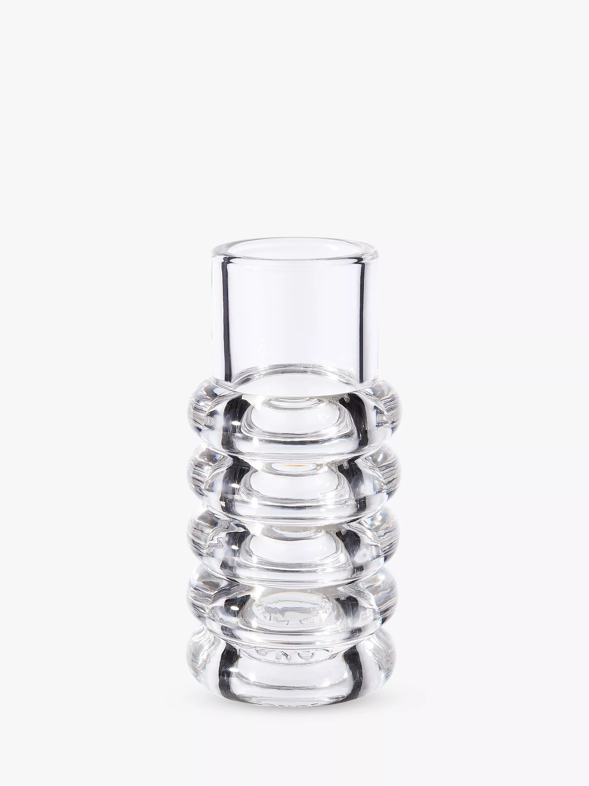 Part of the Press range from Tom Dixon, this vase is made from heavyweight glass that's industrially pressed into an iron mould. It's perfectly engineered to create a kaleidoscopic light show as the rib-like middle refracts light through the glass. This simple addition of ribbing gives the traditional column shape a new and modern edge, creating the illusion of bent stems through the vase.