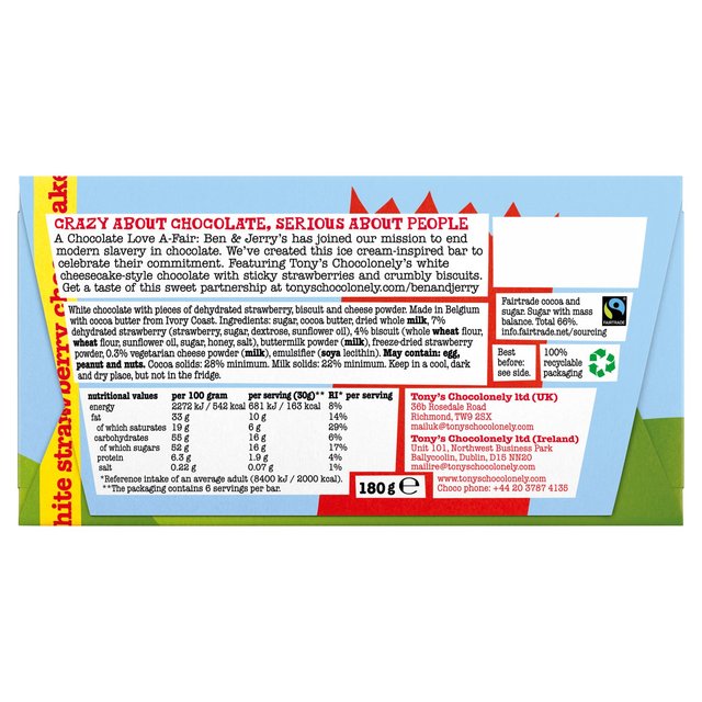 A chocolate love a-fair: Ben & Jerry's has joined our mission to end modern slavery in chocolate. We've created this ice cream-inspired bar to celebrate their commitment. Featuring Tony's Chocolanely's white cheesecake-style chocolate with sticky strawberries and crumbly biscuits.Manufacturer