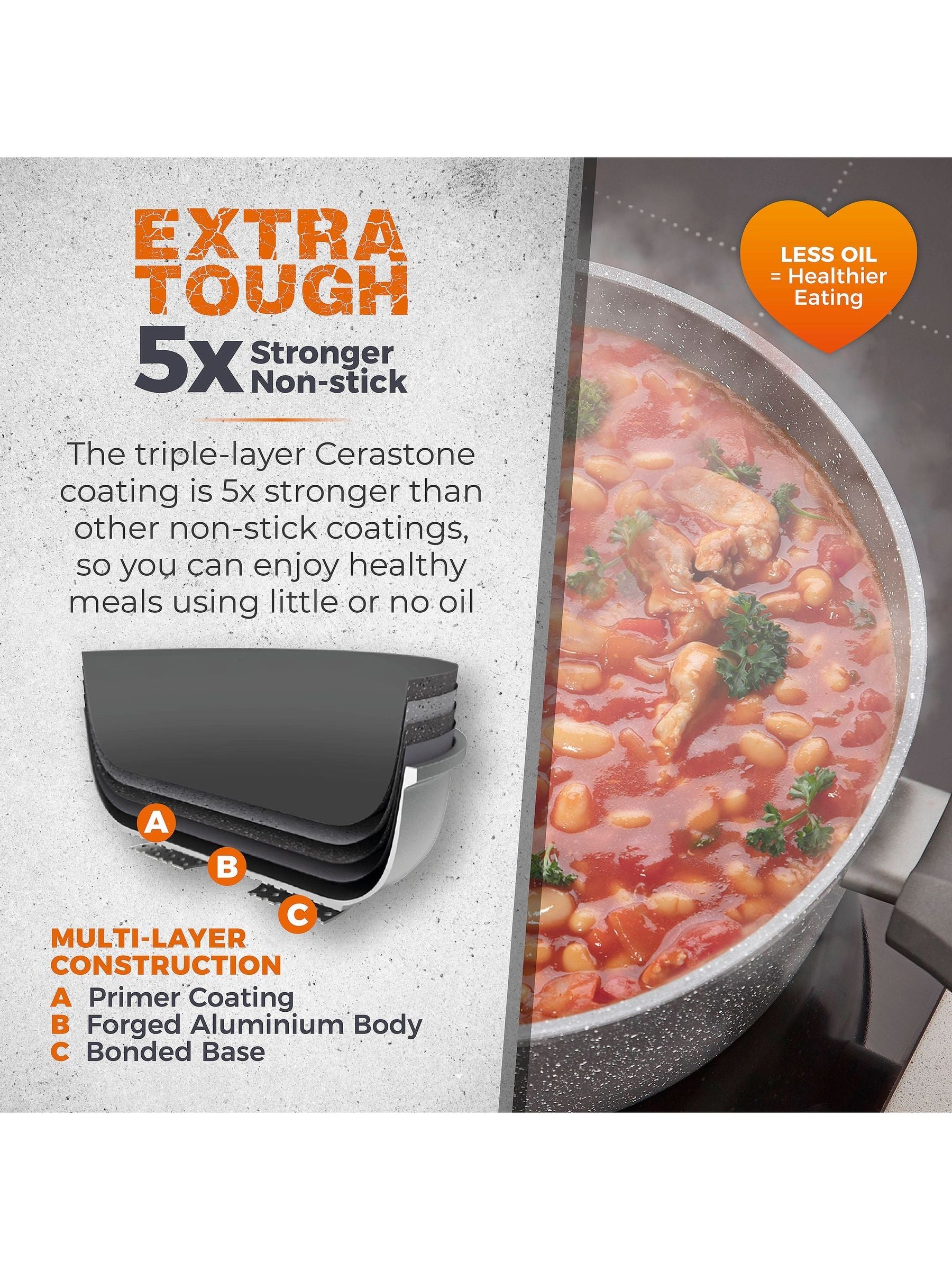 Cook deliciously wholesome, slow-cooked casseroles and hearty stews with the Tower 24cm Casserole Grey Pot. Featuring high-grade non-stick technology, the Cerastone coating is 5x stronger than other non-stick coatings, and is PFAS, PFOA, PFTE, lead and cadmium-free so you can enjoy healthy meals using little or no oil. Its high quality, long-lasting forged aluminium body enables quick and easy adjustment of temperatures for more efficient cooking results, with no hot spots.